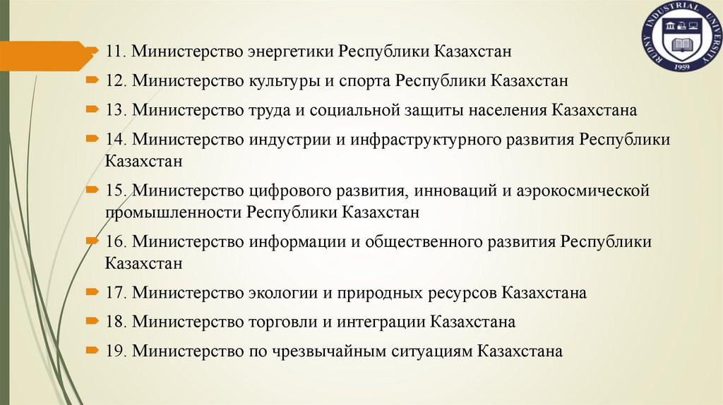11. Министерство энергетики Республики Казахстан12. Министерство культуры и спорта Республики Казахстан