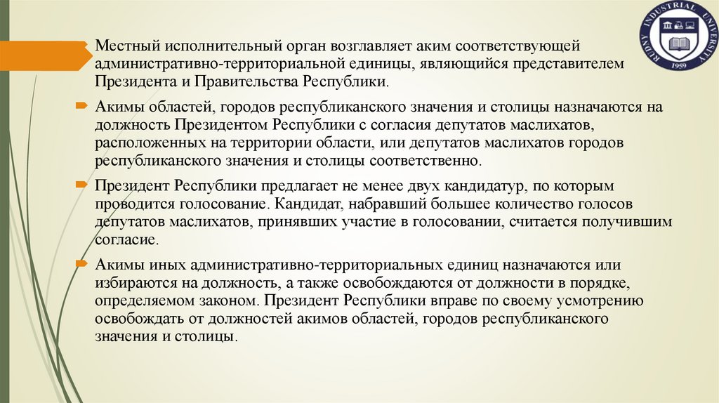 Местные представительные органы – маслихаты выражают волю населениясоответствующих административно-территориальных единиц и с учетом