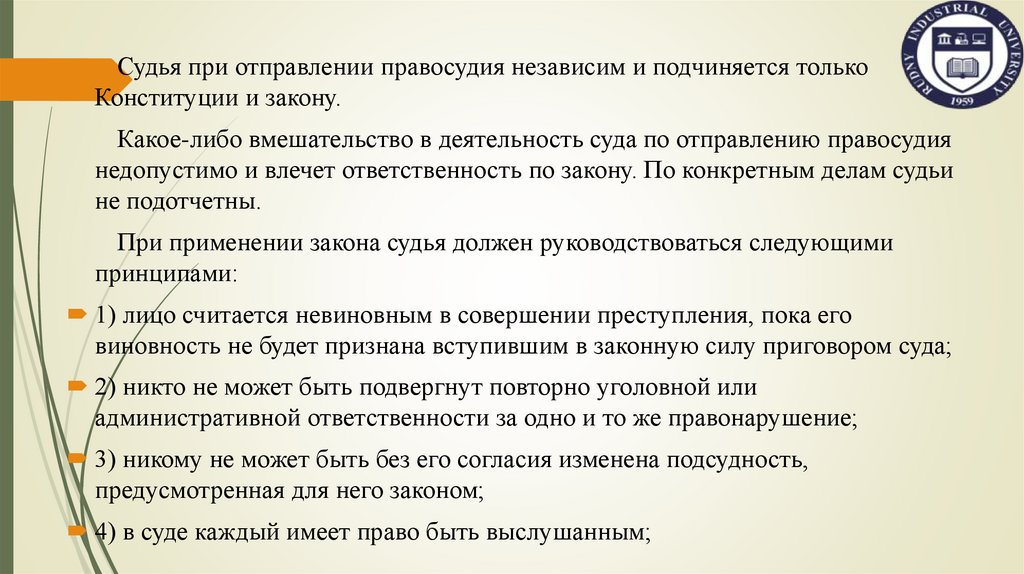 Судья при отправлении правосудия независим и подчиняется толькоКонституции и закону.