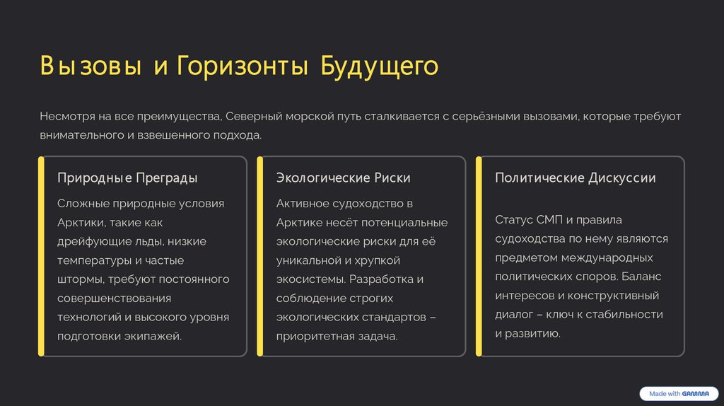 В ы зов ы и Горизонты БудущегоНесмотря на все преимущества, Северный морской путь сталкивается с серьёзными вызовами, которые требуют