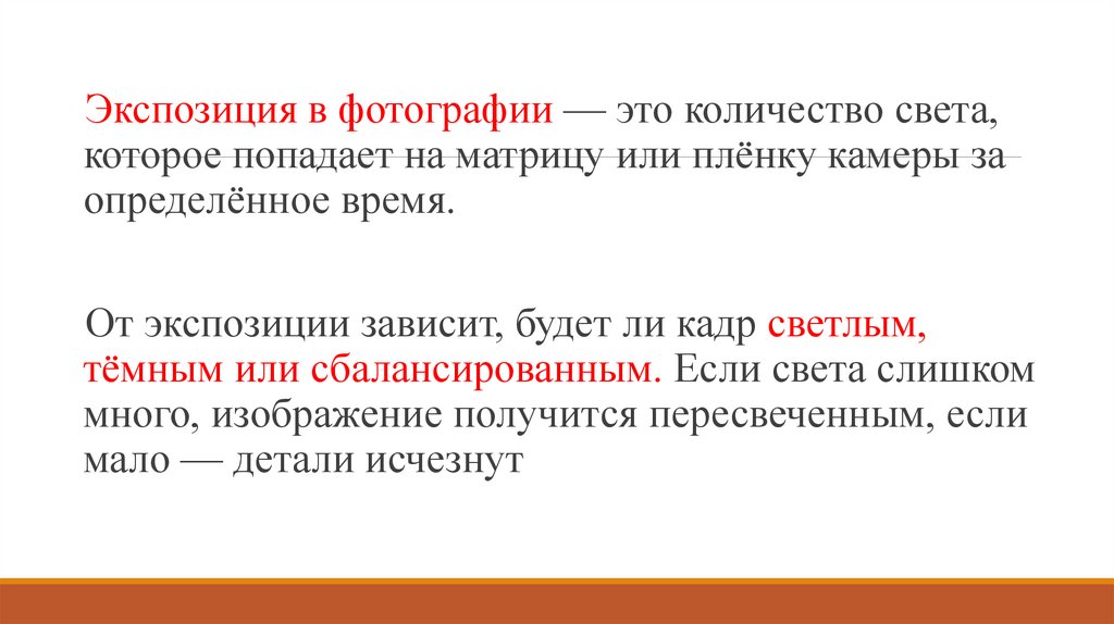 Экспозиция в фотографии — это количество света,которое попадает на матрицу или плёнку камеры за
