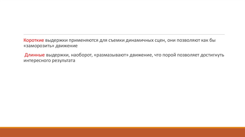 Короткие выдержки применяются для съемки динамичных сцен, они позволяют как бы«заморозить» движение