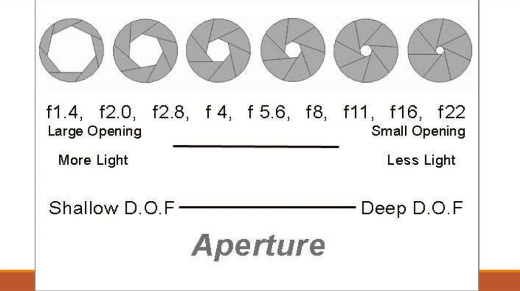 Диафрагма — размер отверстия в объективе, через которое свет попадает на сенсор.Измеряется в диафрагменных числах (f-стопах)