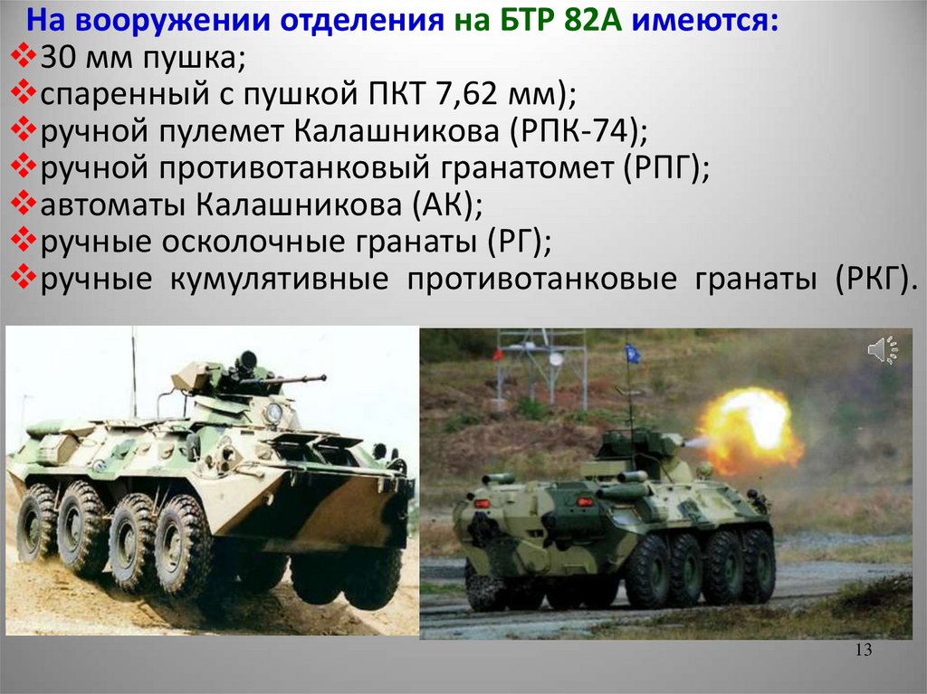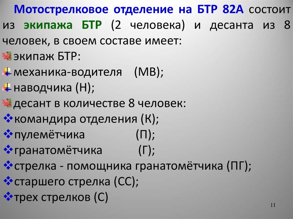 Мотострелковое отделение на БТР 82А состоитиз экипажа БТР (2 человека) и десанта из 8