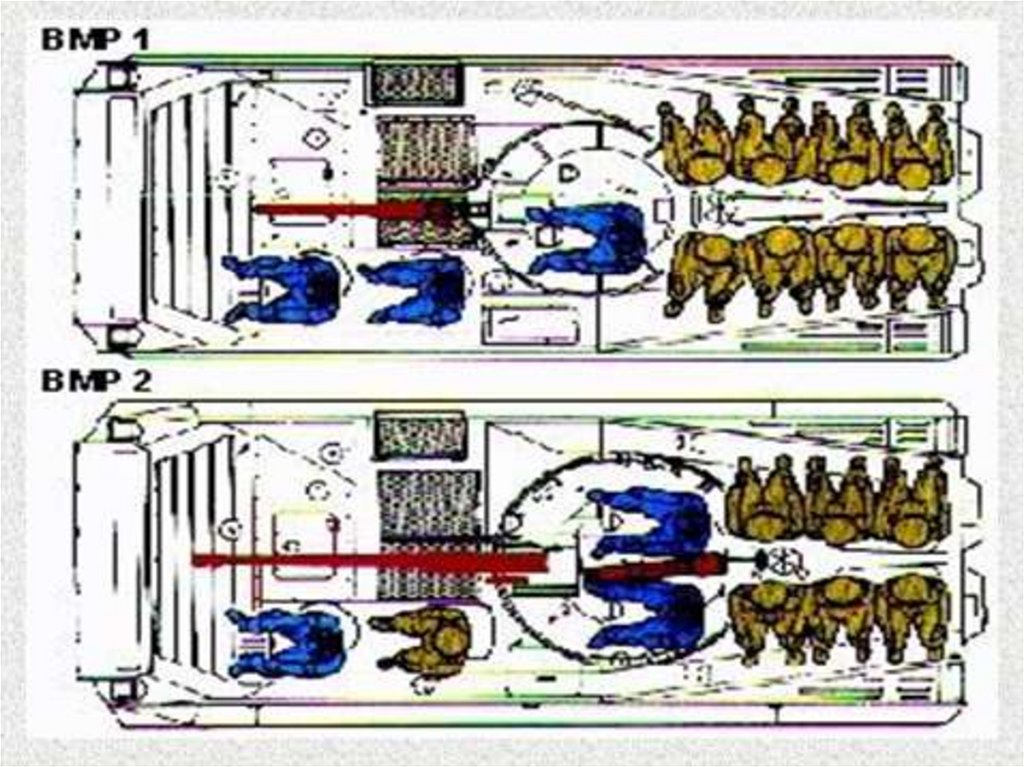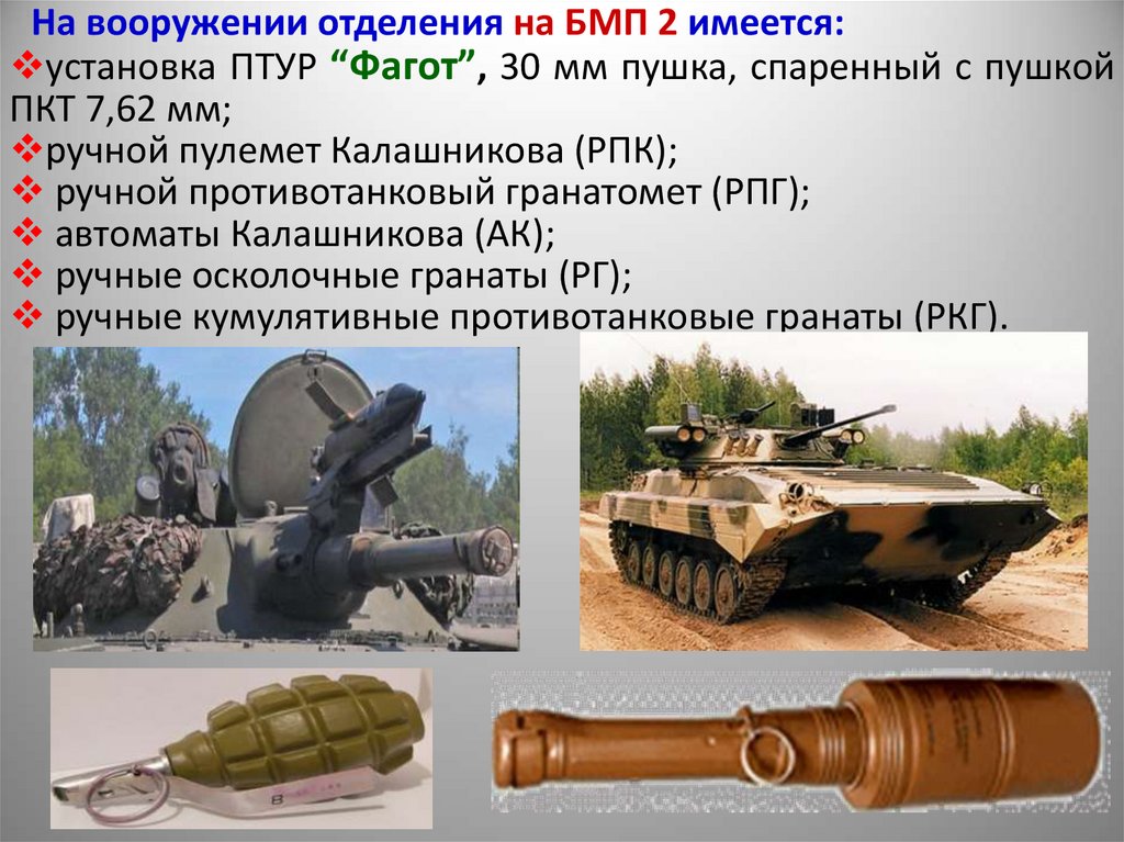 На вооружении отделения на БМП 2 имеется:установка ПТУР “Фагот”, 30 мм пушка, спаренный с пушкой