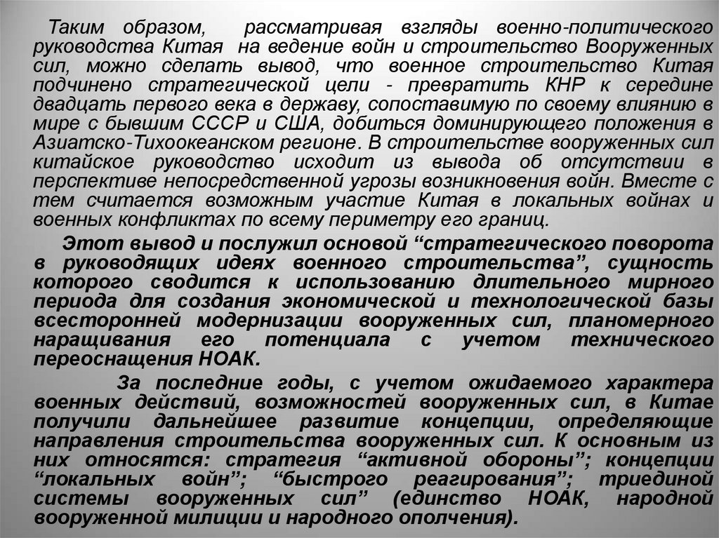 Таким образом, рассматривая взгляды военно-политического руководстваКитая на ведение войн и строительство Вооруженных сил, можно сделать