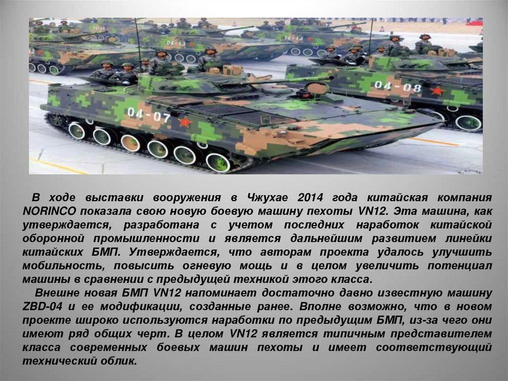 В ходе выставки вооружения в Чжухае 2014 года китайская компанияNORINCO показала свою новую боевую машину пехоты VN12. Эта машина, как