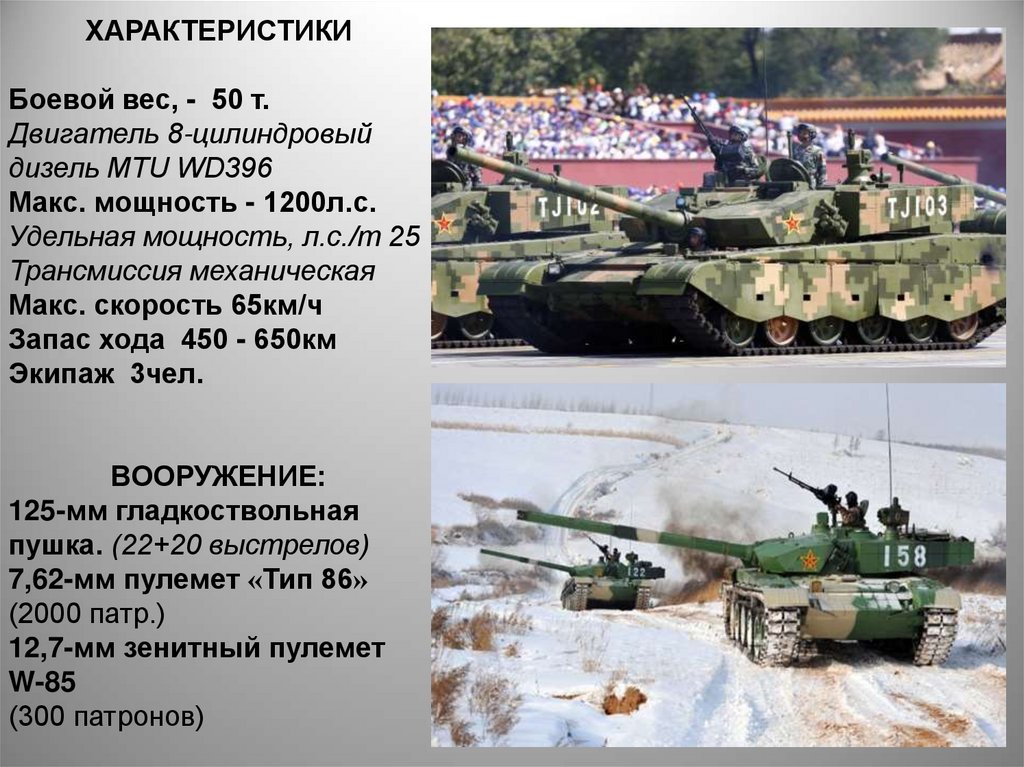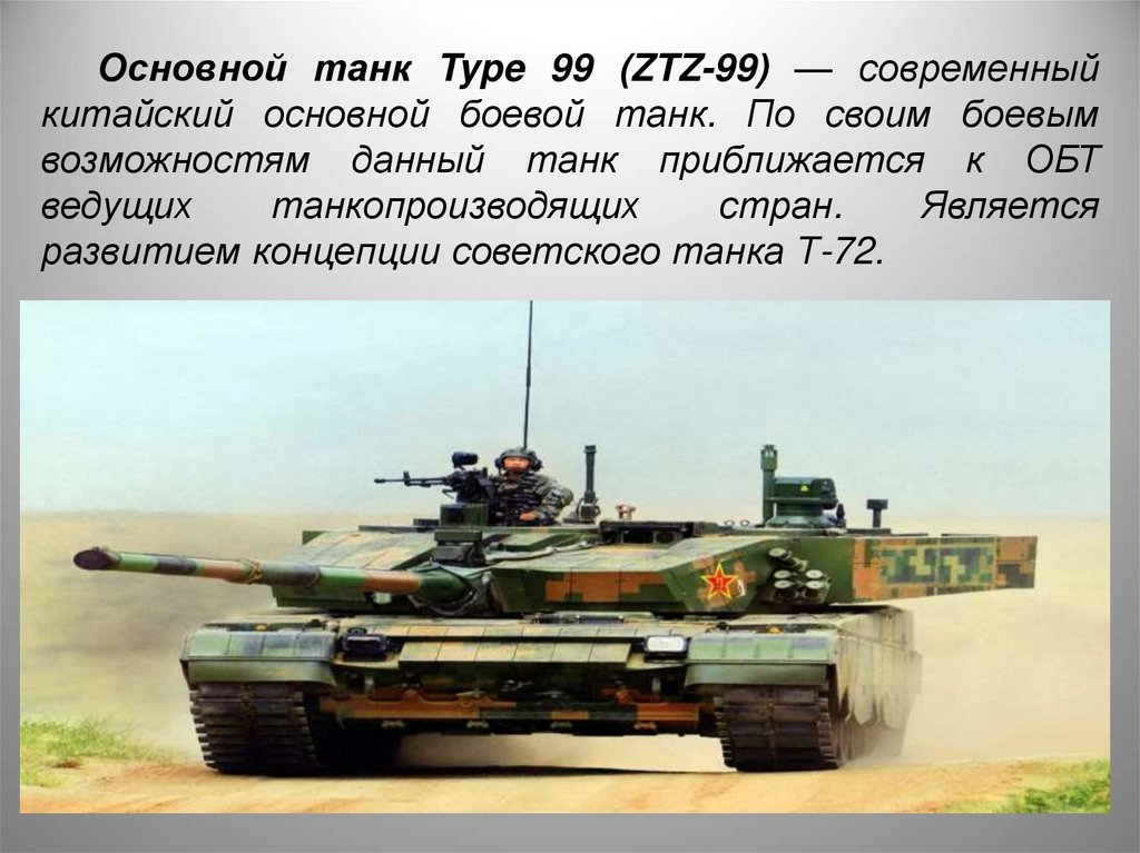 Основной танк Type 99 (ZTZ-99) — современныйкитайский основной боевой танк. По своим боевым