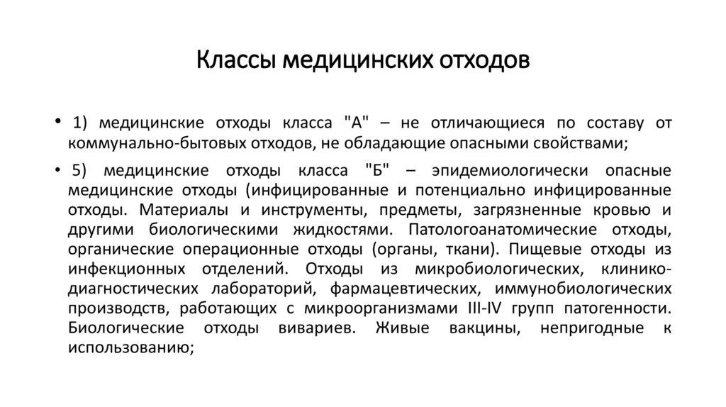 Классы медицинских отходов• 1) медицинские отходы класса "А" – не отличающиеся по составу от