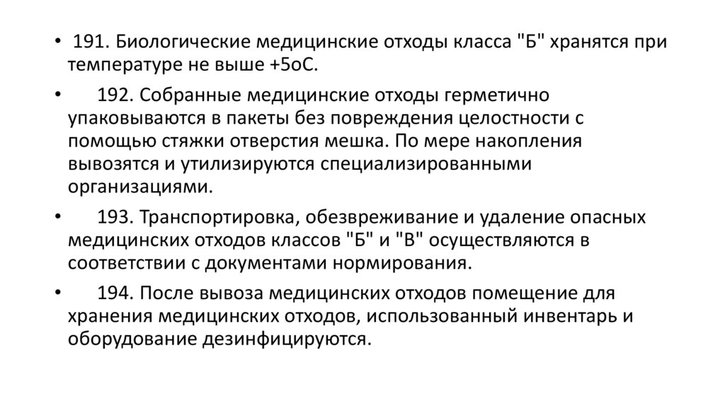• 191. Биологические медицинские отходы класса "Б" хранятся притемпературе не выше +5оС.