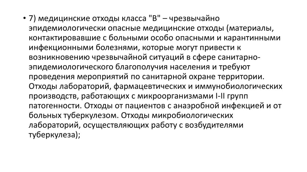 • 7) медицинские отходы класса "В" – чрезвычайноэпидемиологически опасные медицинские отходы (материалы,