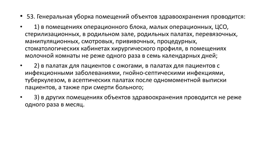 • 53. Генеральная уборка помещений объектов здравоохранения проводится:1) в помещениях операционного блока, малых операционных, ЦСО,