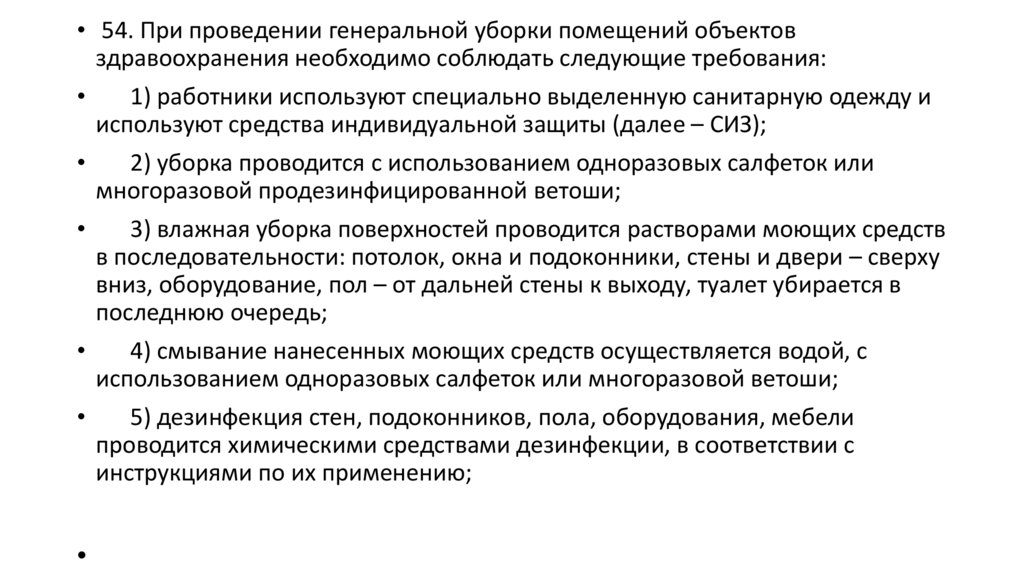 • 54. При проведении генеральной уборки помещений объектовздравоохранения необходимо соблюдать следующие требования: