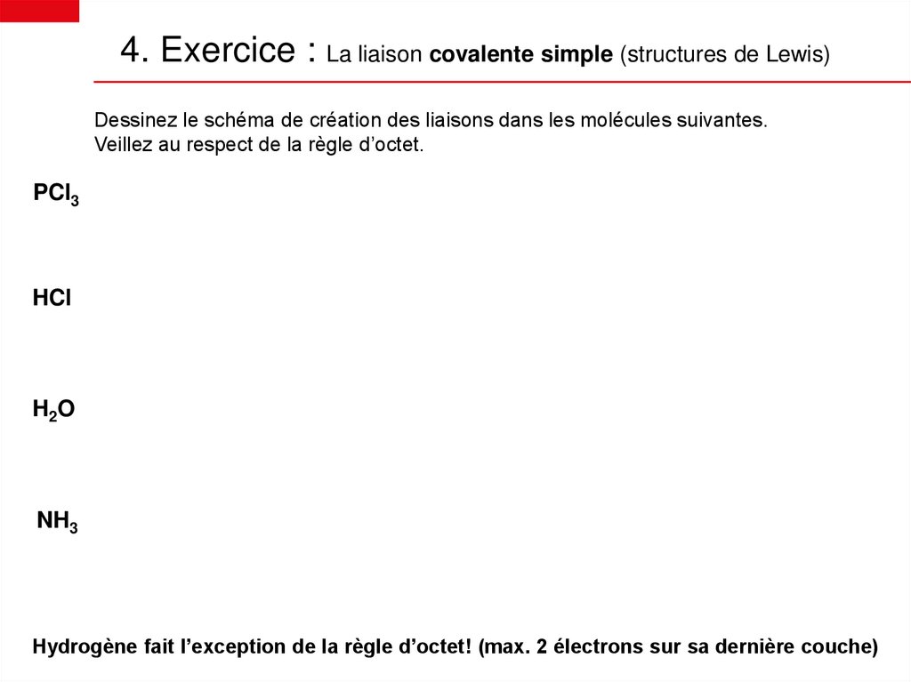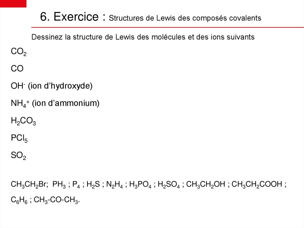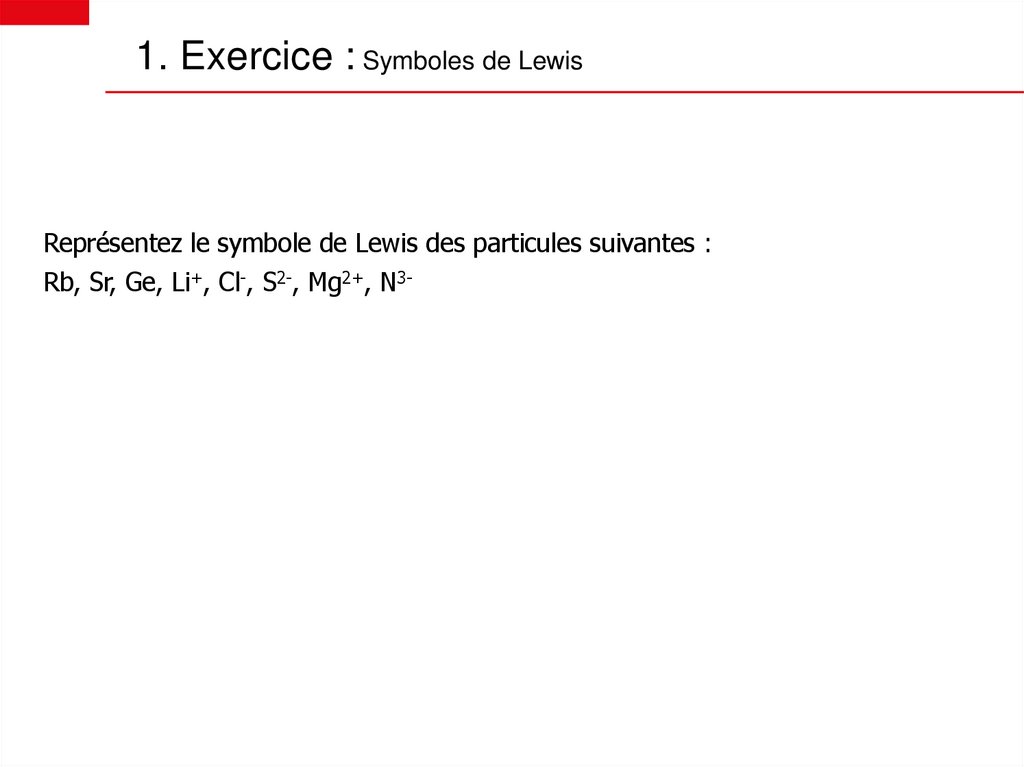 1. Exercice : Symboles de LewisReprésentez le symbole de Lewis des particules suivantes :