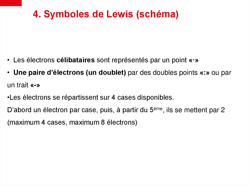 4. Symboles de Lewis (schéma)• Les électrons célibataires sont représentés par un point «·»