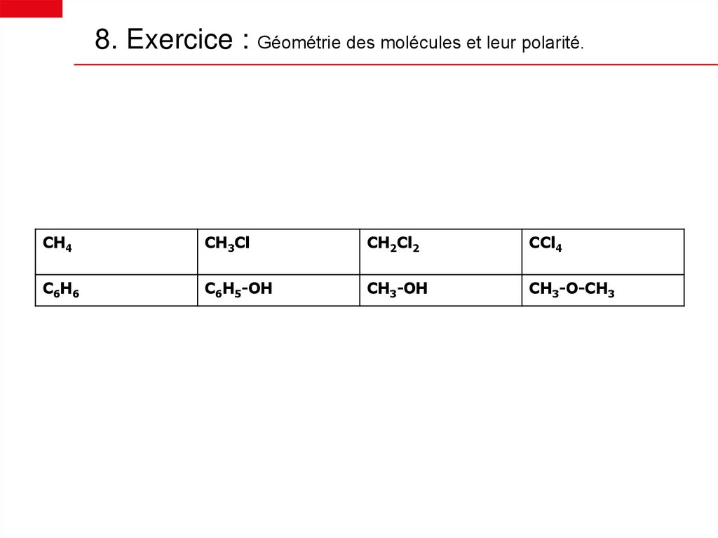 8. Exercice : Géométrie des molécules et leur polarité.CH4
