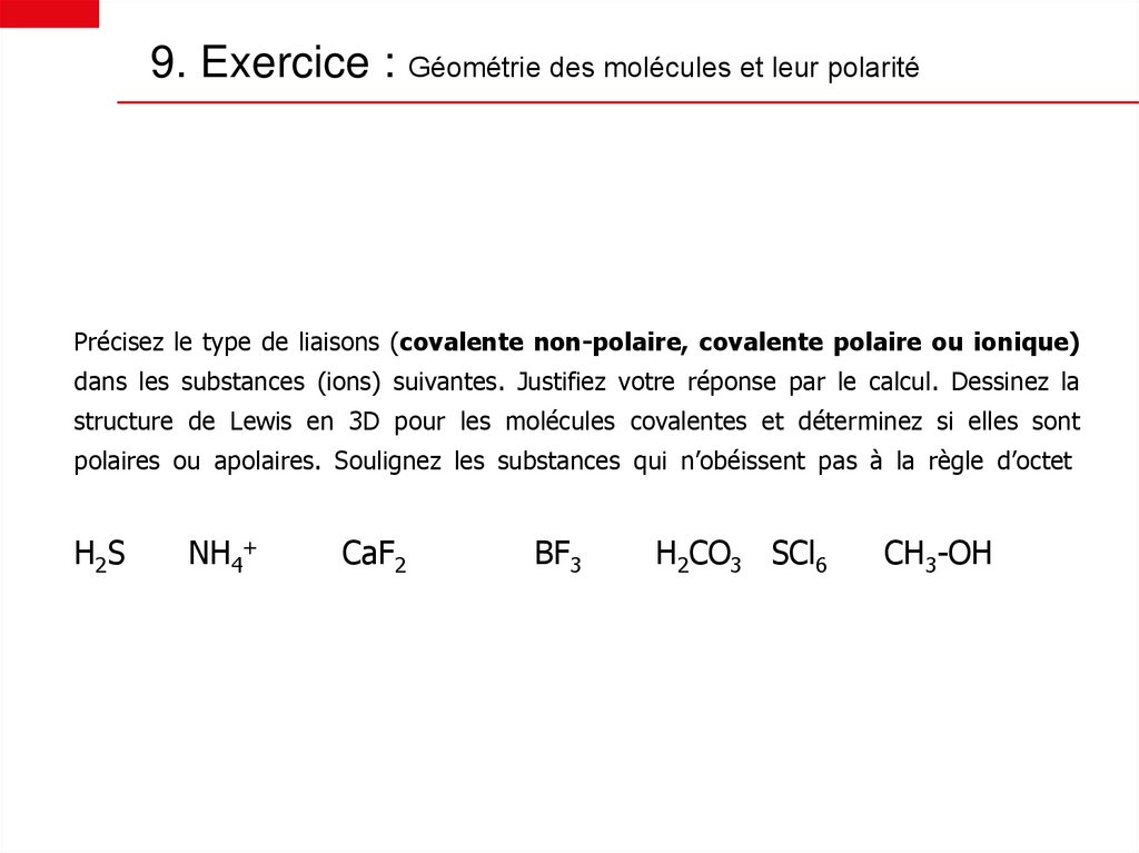 9. Exercice : Géométrie des molécules et leur polaritéPrécisez le type de liaisons (covalente non-polaire, covalente polaire ou ionique)