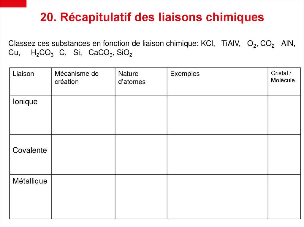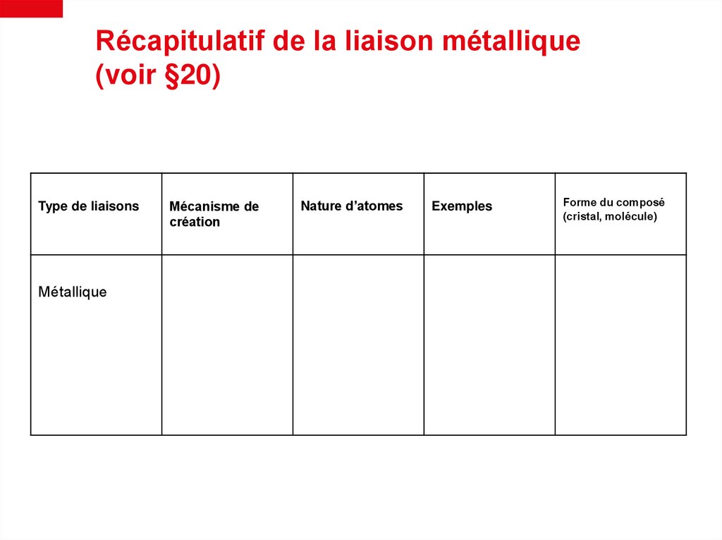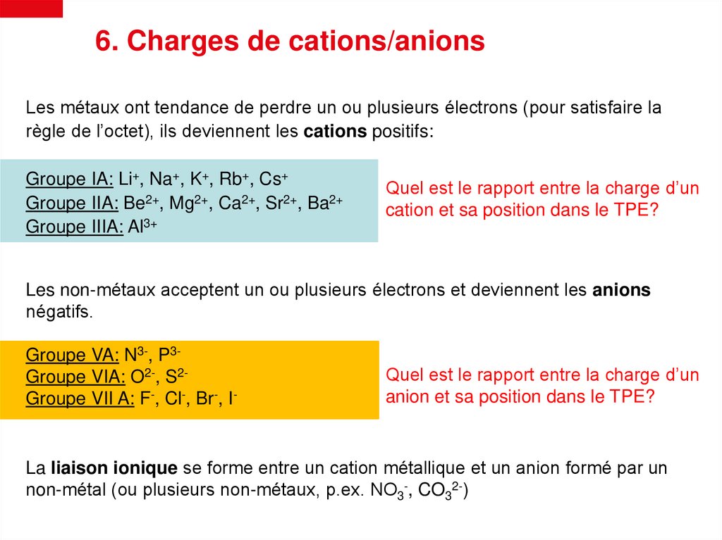 6. Charges de cations/anionsLes métaux ont tendance de perdre un ou plusieurs électrons (pour satisfaire la