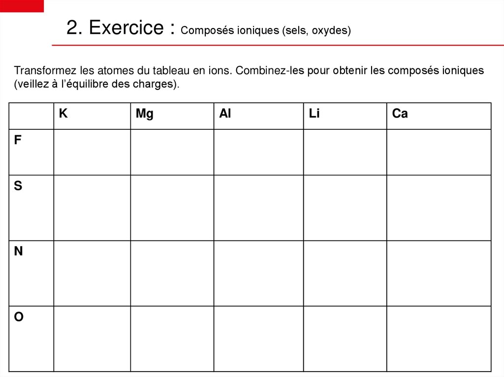 2. Exercice : Composés ioniques (sels, oxydes)Transformez les atomes du tableau en ions. Combinez-les pour obtenir les composés ioniques