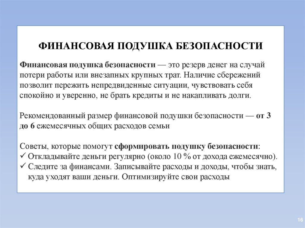 ФИНАНСОВАЯ ПОДУШКА БЕЗОПАСНОСТИФинансовая подушка безопасности — это резерв денег на случай