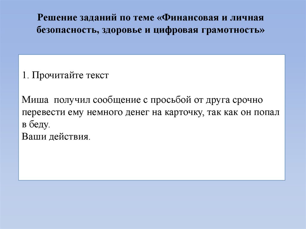 Решение заданий по теме «Финансовая и личнаябезопасность, здоровье и цифровая грамотность»