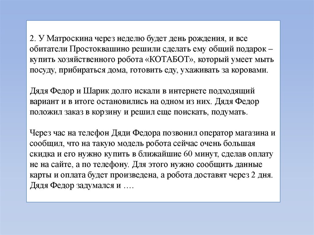 2. У Матроскина через неделю будет день рождения, и всеобитатели Простоквашино решили сделать ему общий подарок –