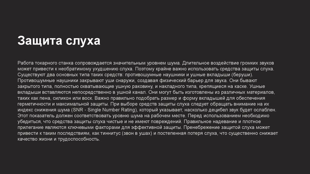 Защита слухаРабота токарного станка сопровождается значительным уровнем шума. Длительное воздействие громких звуков