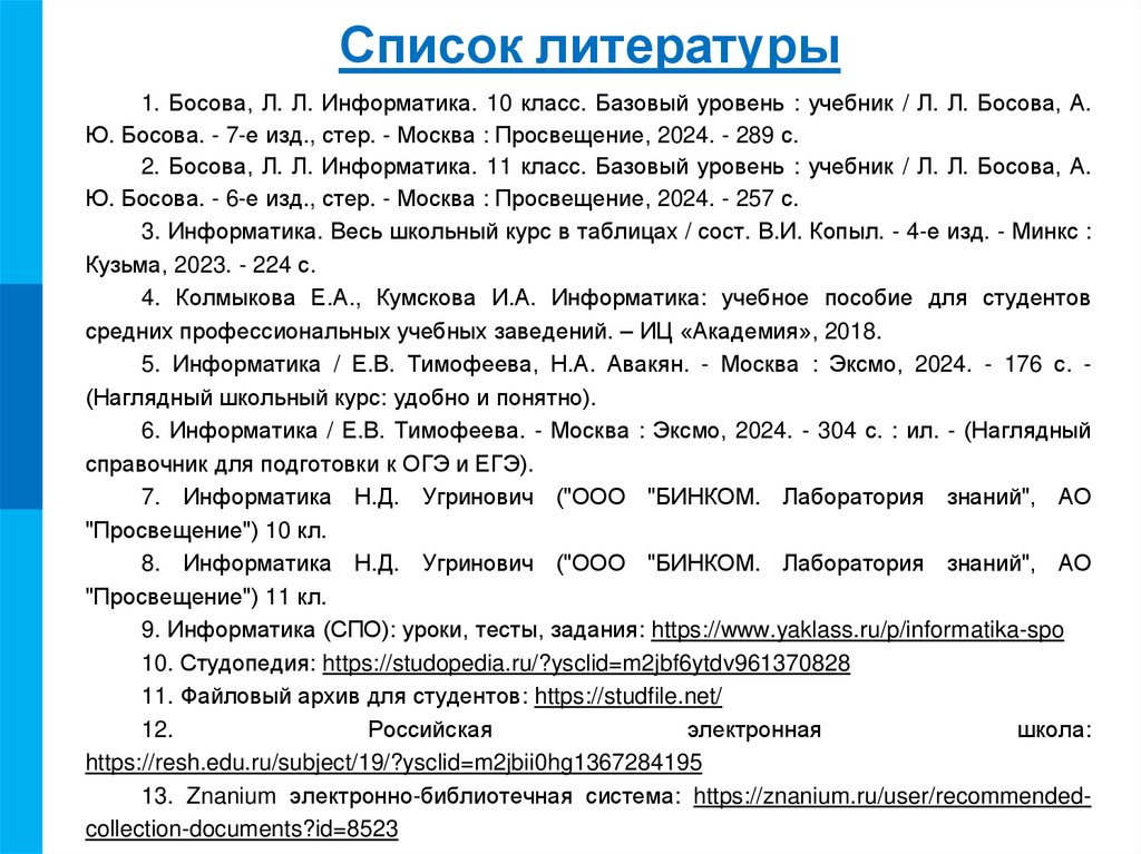 1. Босова, Л. Л. Информатика. 10 класс. Базовый уровень : учебник / Л. Л. Босова, А.