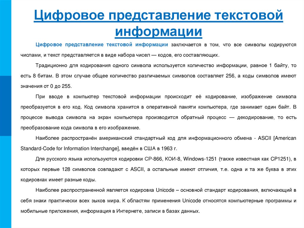 Цифровое представление текстовой информации заключается в том, что все символы кодируются