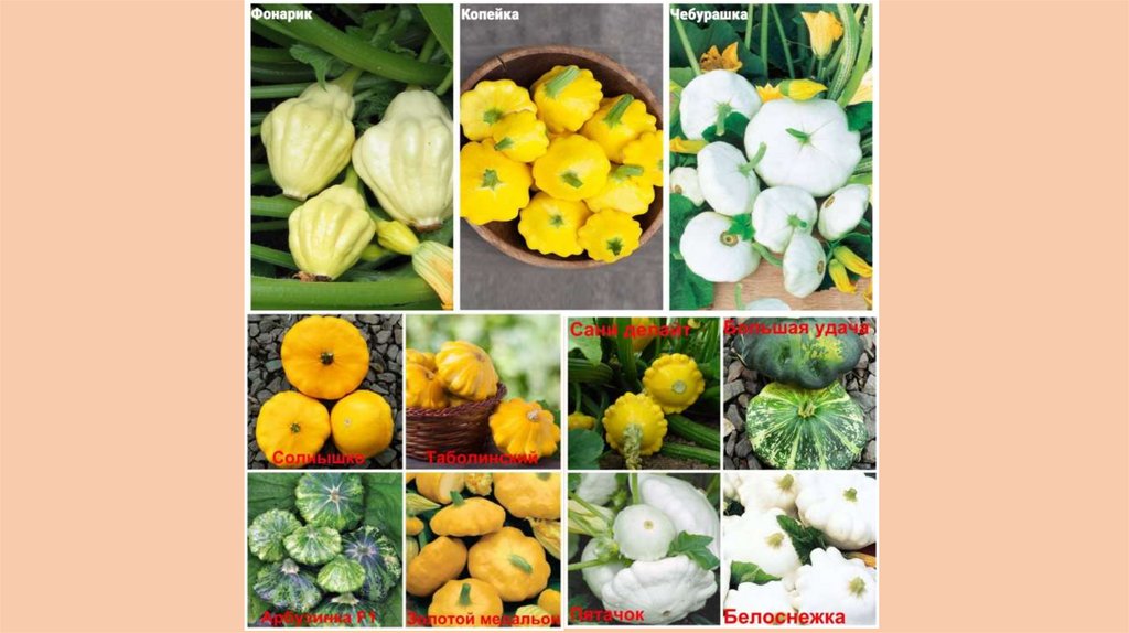 • Классификацию патиссонов проводятпо форме плодов, их окрасе плодов и