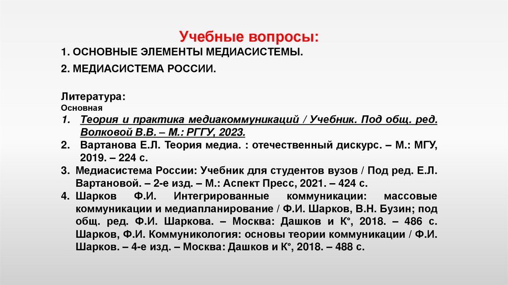Учебные вопросы:1. ОСНОВНЫЕ ЭЛЕМЕНТЫ МЕДИАСИСТЕМЫ.