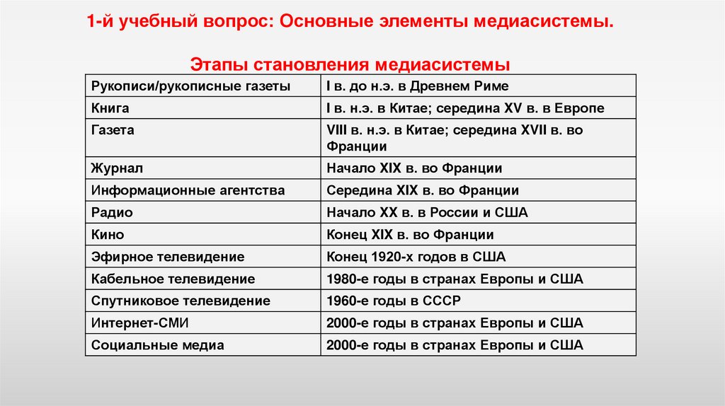 1-й учебный вопрос: Основные элементы медиасистемы.Этапы становления медиасистемы