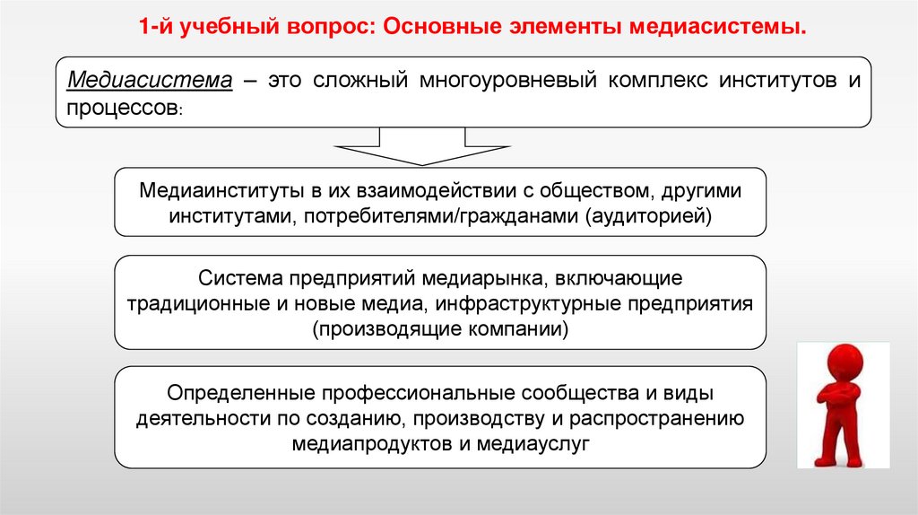 1-й учебный вопрос: Основные элементы медиасистемы.Медиасистема – это сложный многоуровневый комплекс институтов и