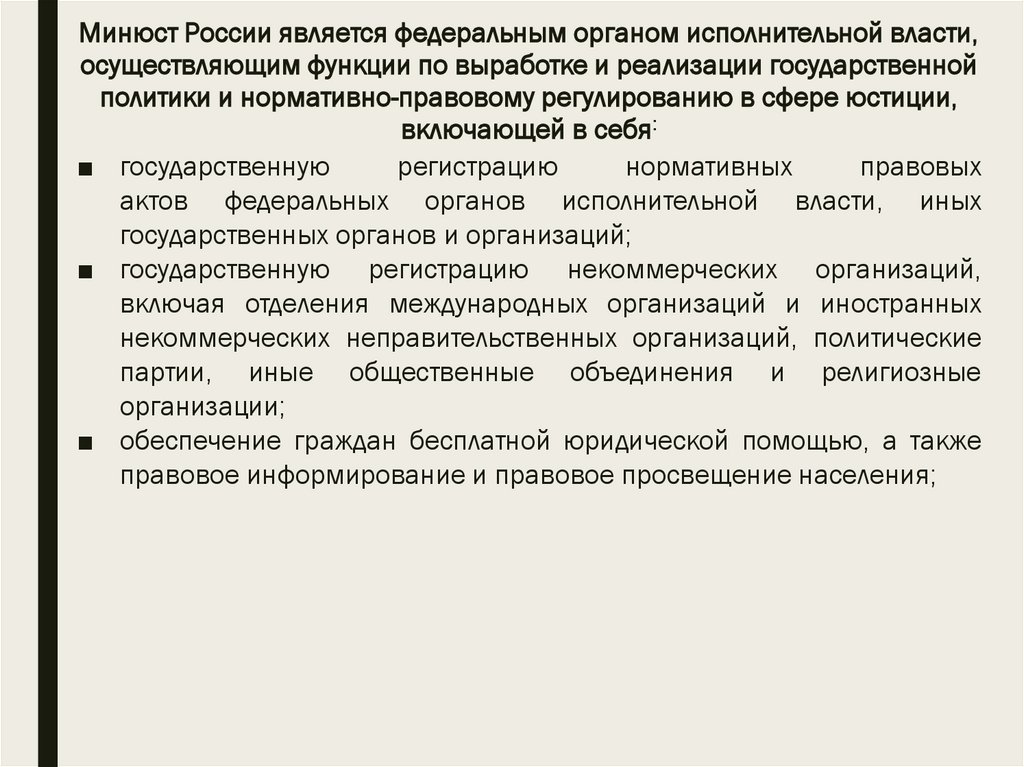 Минюст России является федеральным органом исполнительной власти,осуществляющим функции по выработке и реализации государственной