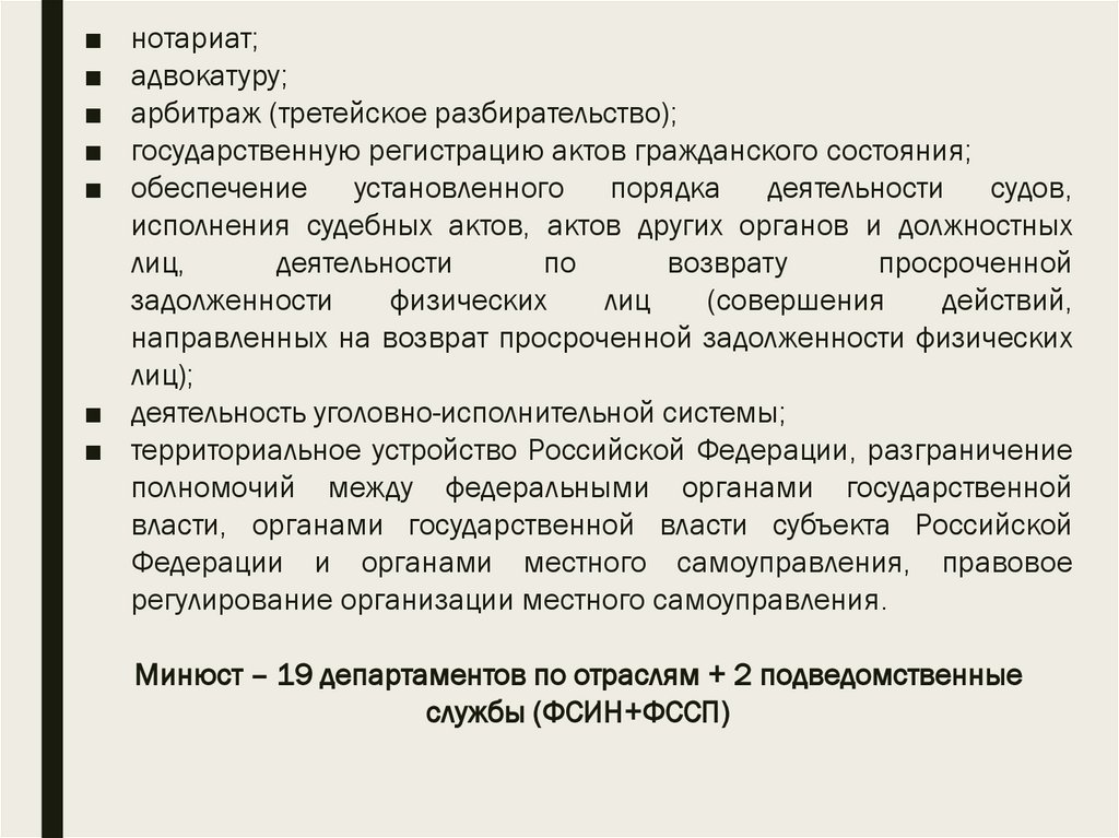 Минюст – 19 департаментов по отраслям + 2 подведомственные