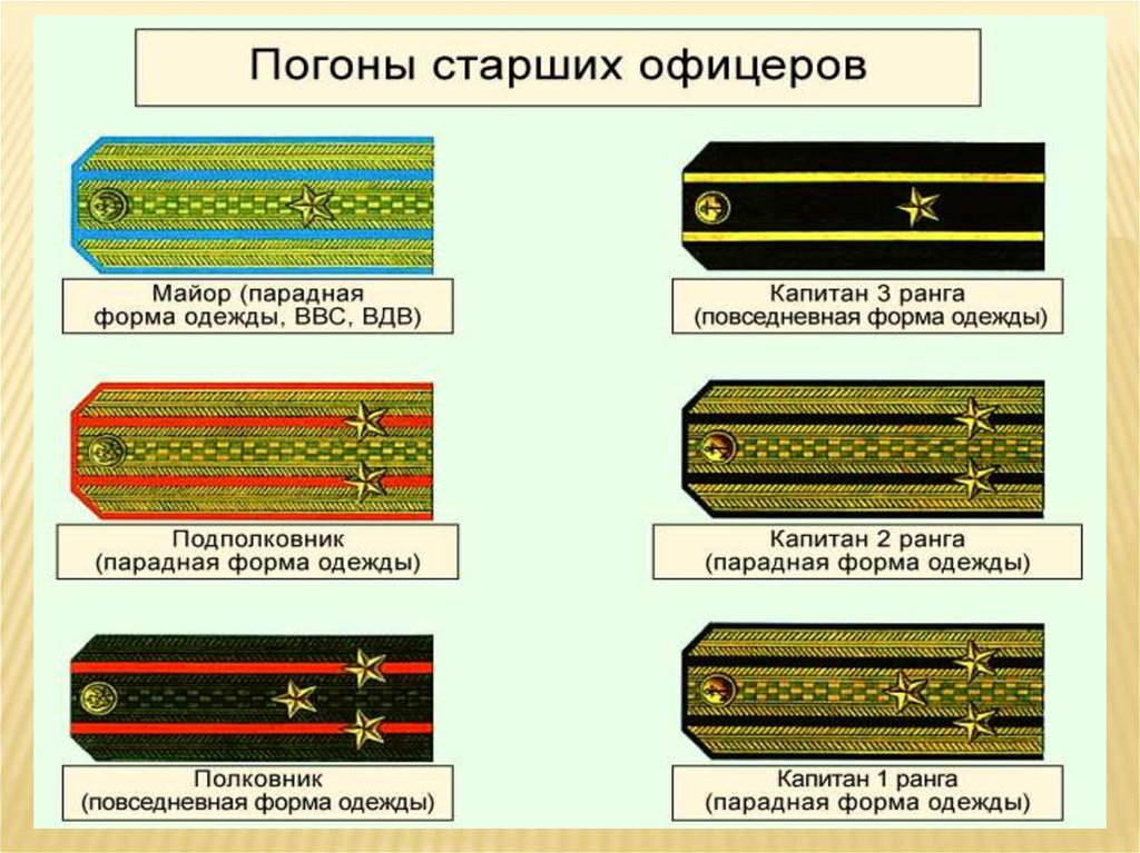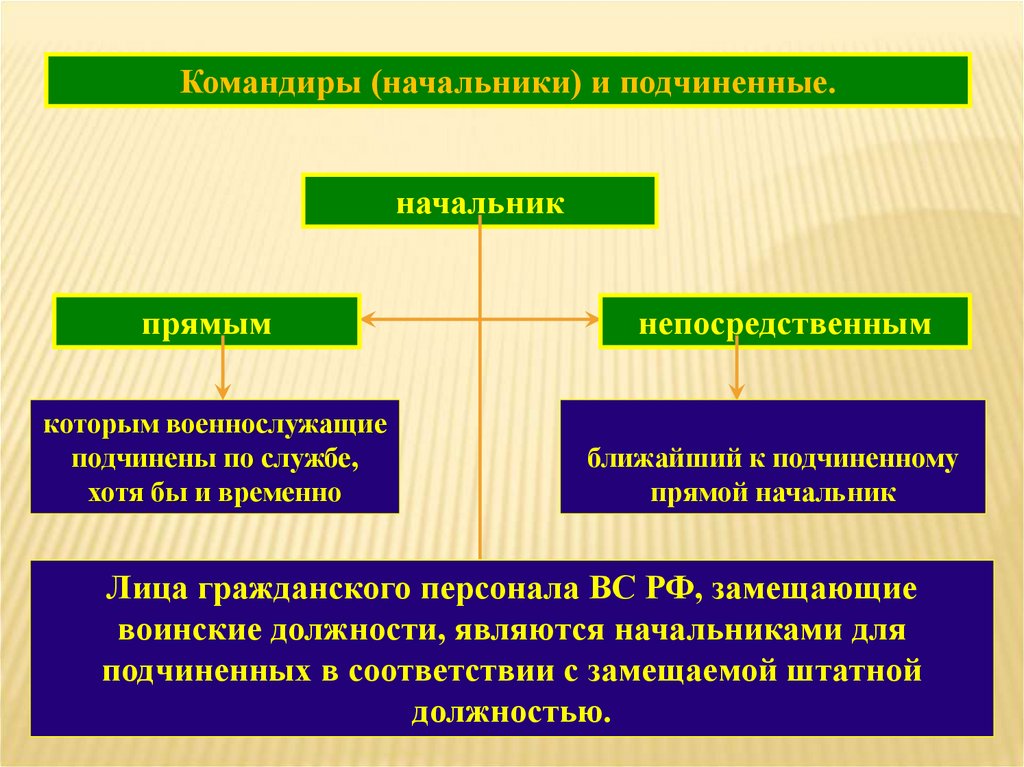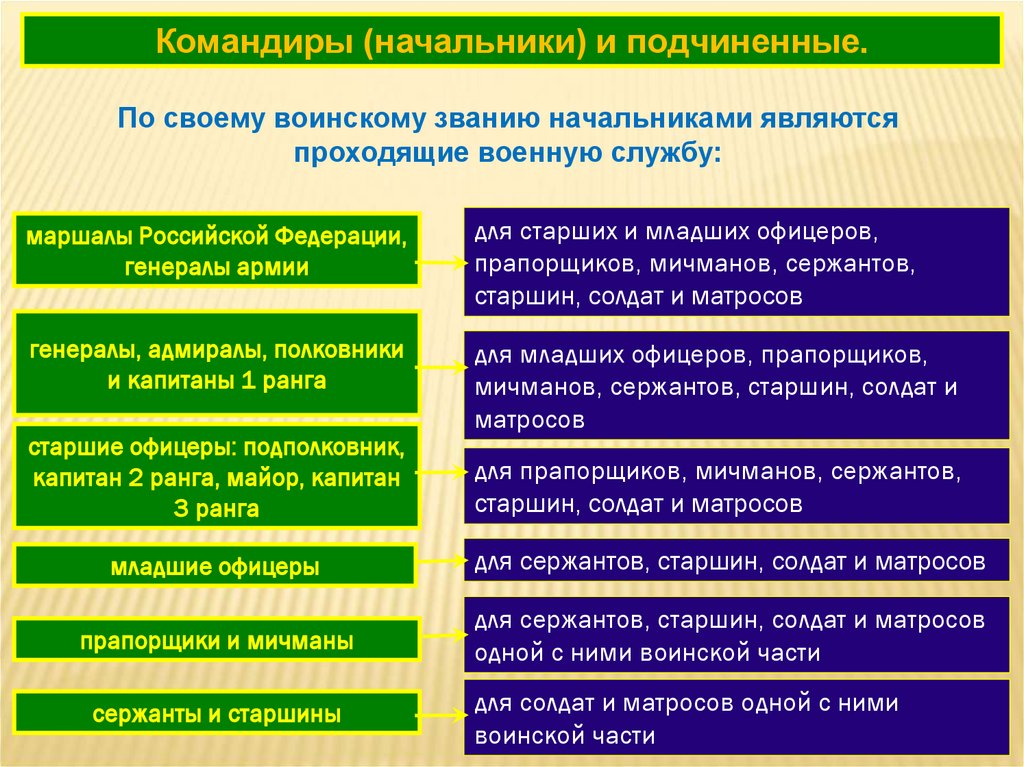 Командиры (начальники) и подчиненные.По своему воинскому званию начальниками являются