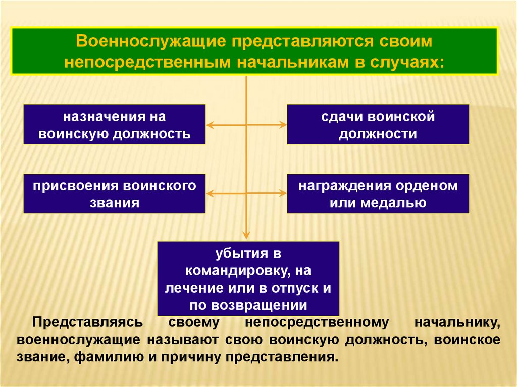 Военнослужащие представляются своимнепосредственным начальникам в случаях:
