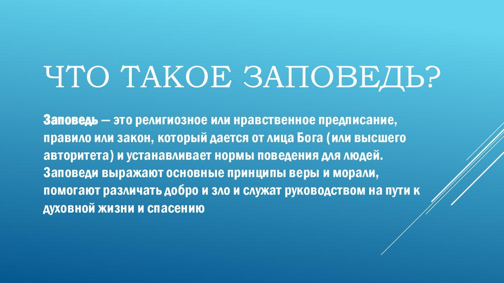 ЧТО ТАКОЕ ЗАПОВЕДЬ?Заповедь — это религиозное или нравственное предписание,