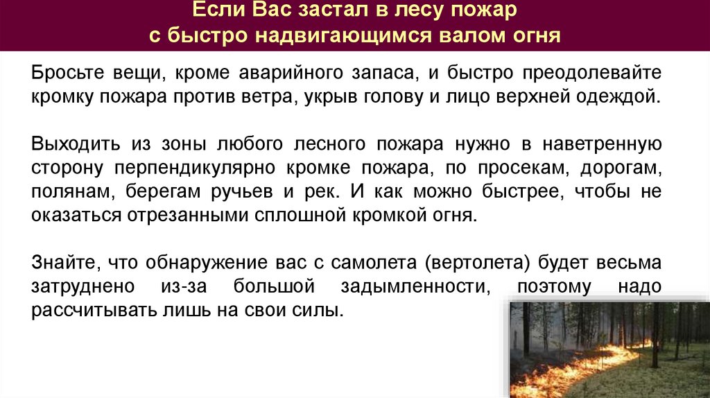 кромку пожара против ветра, укрыв голову и лицо верхней одеждой.