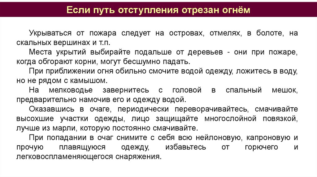 Если путь отступления отрезан огнёмУкрываться от пожара следует на островах, отмелях, в болоте, на