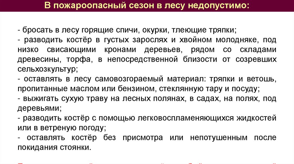 В пожароопасный сезон в лесу недопустимо:- бросать в лесу горящие спичи, окурки, тлеющие тряпки;