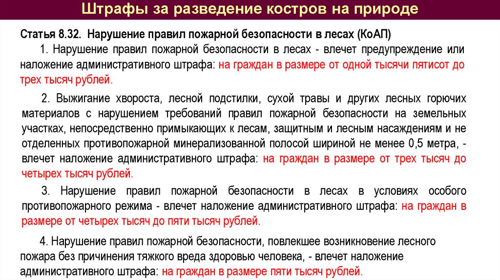 Штрафы за разведение костров на природеСтатья 8.32. Нарушение правил пожарной безопасности в лесах (КоАП)