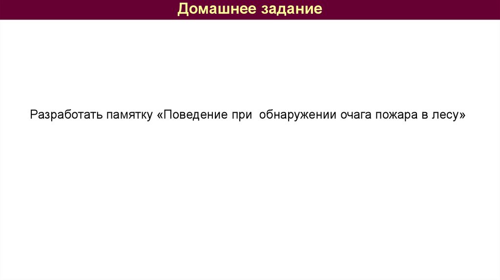 Домашнее заданиеРазработать памятку «Поведение при обнаружении очага пожара в лесу»