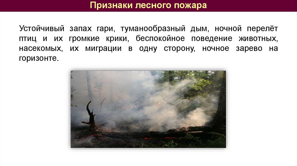 Признаки лесного пожараУстойчивый запах гари, туманообразный дым, ночной перелёт