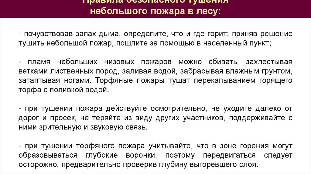 Правила безопасного тушениянебольшого пожара в лесу: