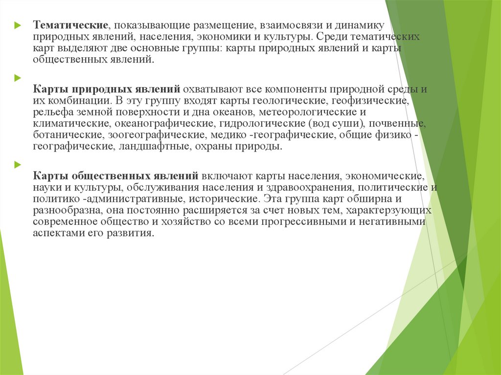 Тематические, показывающие размещение, взаимосвязи и динамикуприродных явлений, населения, экономики и культуры. Среди тематических