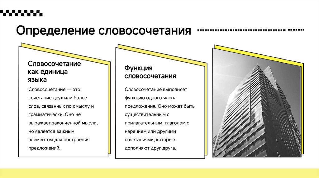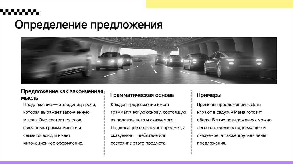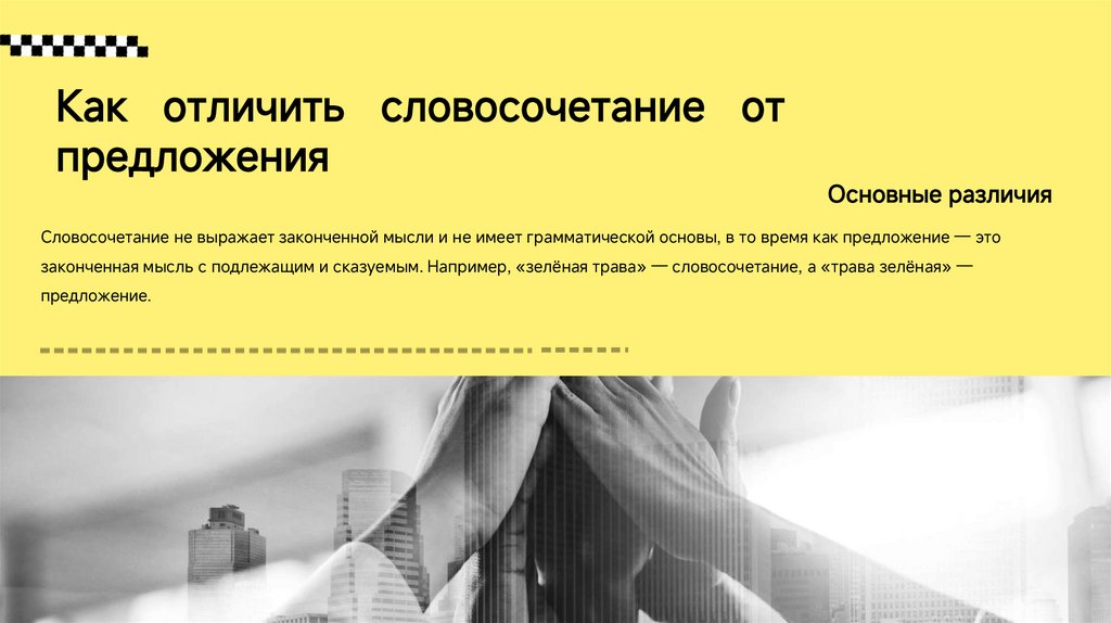 законченная мысль с подлежащим и сказуемым. Например, «зелёная трава» — словосочетание, а «трава зелёная» —