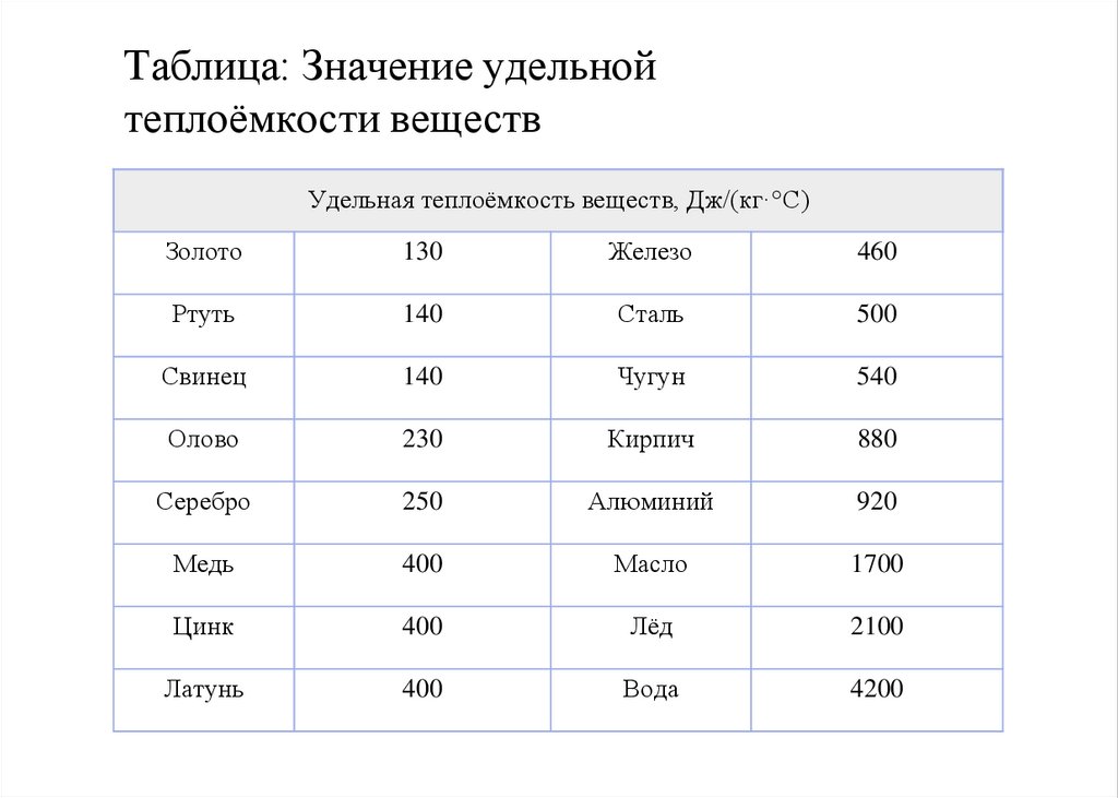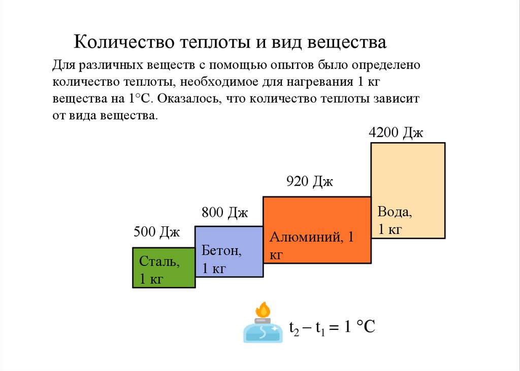 Количество теплоты и вид веществаДля различных веществ с помощью опытов было определено
