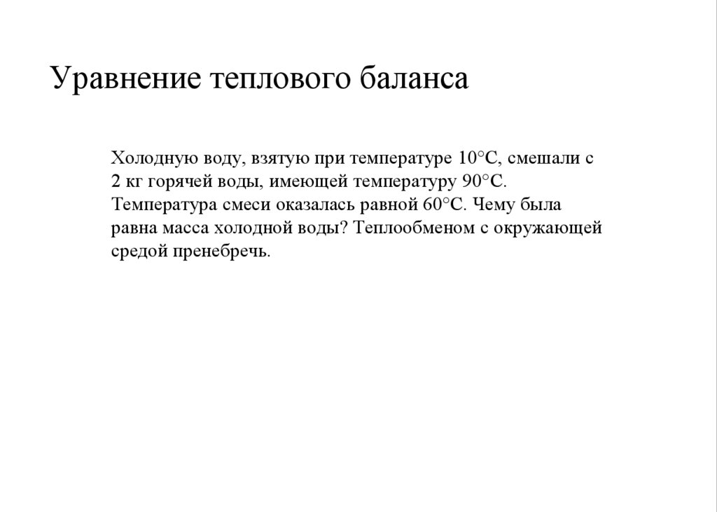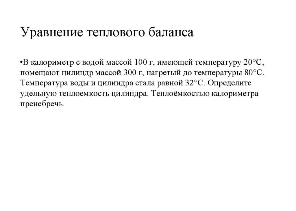 Уравнение теплового баланса•В калориметр с водой массой 100 г, имеющей температуру 20°С,