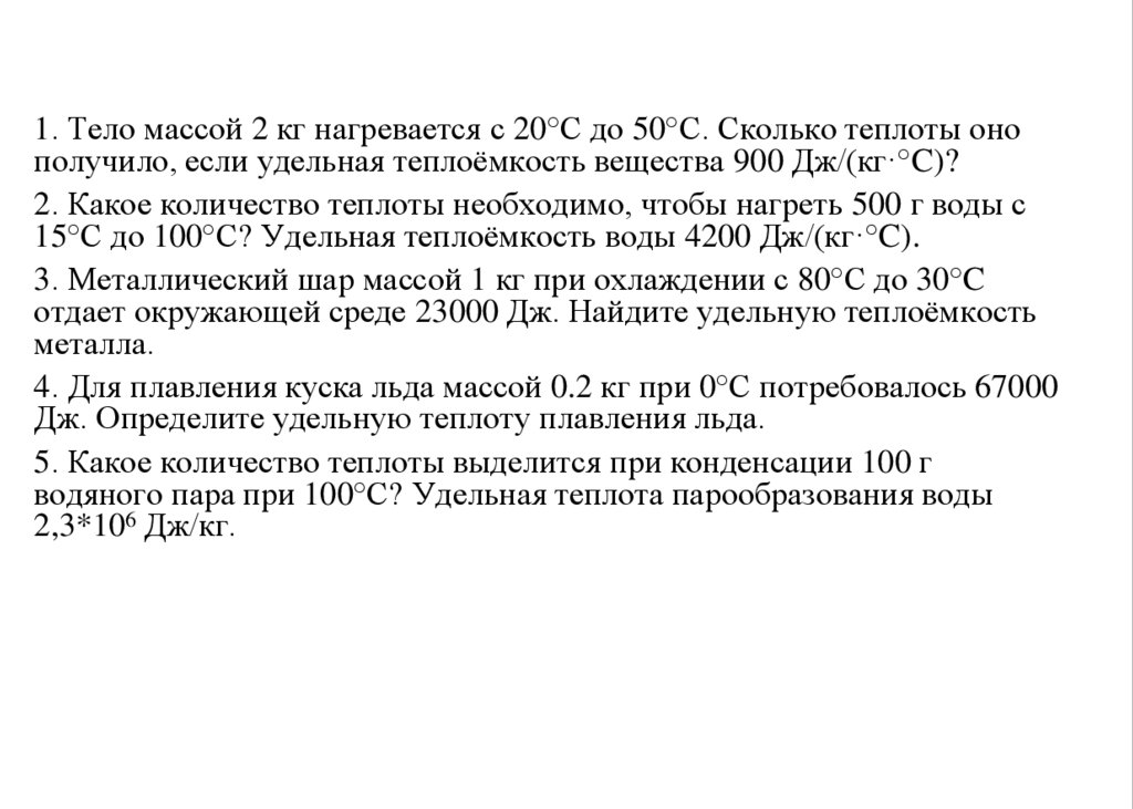 1. Тело массой 2 кг нагревается с 20°C до 50°C. Сколько теплоты онополучило, если удельная теплоёмкость вещества 900 Дж/(кг·°C)?